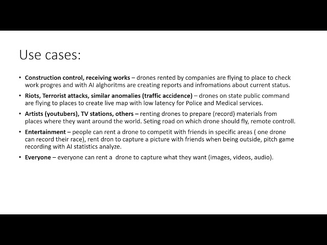 Siatka dronów, które przy pomocy 5G mogą być wykorzystywane do różnych zadań na życzenie klientów poprzez stronę internetową. Użytkownicy wynajmują drona, którego wykorzystują do swoich celów np. analizowanie statystyk z meczu, tworzenie map live w kryzysowych sytuacjach, ale i podczas wydarzeń sportowych (np. maraton), odbieranie prac budowlanych. Na stronie programiści tworzą profile do dronów (algorytm AI, aplikacje), które są dostępne dla każdego w ramach abonametu, subskrypcji lub wersji darmowej. Dzięki algorytmom AI oraz sieci 5G takie rozwiązanie może zapewnić nowe miejsca pracy w technologiach oraz zaawansowaną technologię miasta w przyszłości, która może używać każdy z nas tak samo jak sieci komórkowe.