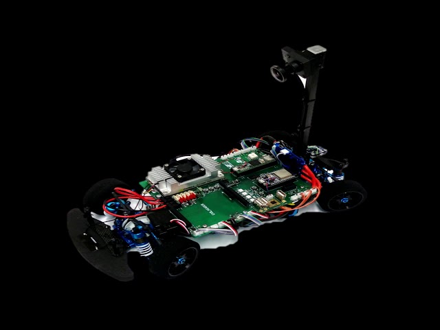 We used a Jetson TK1 in our previous two cars and switched to a TX2 now. The base frame is a standard rc car chassis. We modified it by making the rear axis steerable, added a camera, a self designed board and two microcontrollers to control the motor and the two servos.
