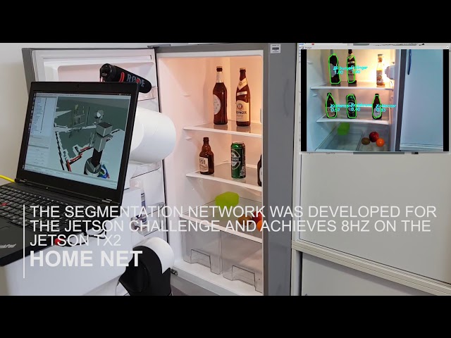 system for manipulating objects. We integrated the semantic segmentation into a practical use case where we propose a state dependent segmentation method. The robot navigates to a fridge, searches for a handle to open it. Once the the fridge is open, the robot takes an other look for segmenting beer bottles and cans inside the fridge and grasps them. In the end the fridge is closed and the beer is delivered. The current focus of use for the Jetson TX2 is the
